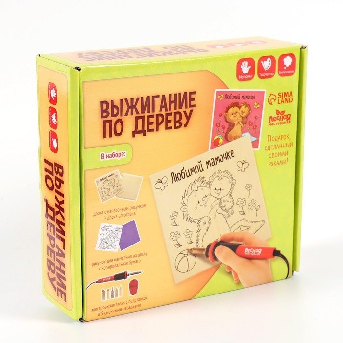 Комплект создан для тех ребятишек, кто ещё не научился самостоятельно придумывать сюжеты, но уже уверенно держит в руках прибор для выжигания. С его помощью малыш легко создаст настоящее произведение искусства на простом кусочке дерева.