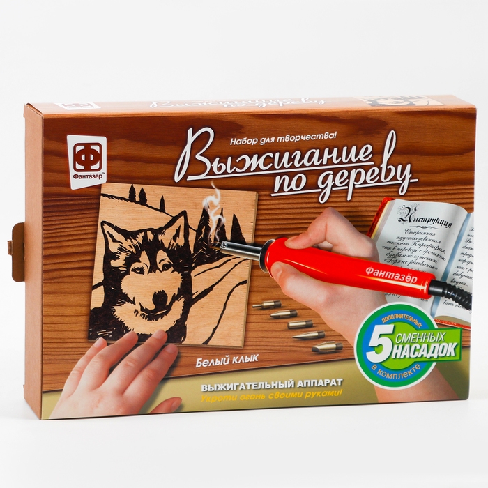 Современный выжигательный аппарат в комплекте с разнообразными насадками позволяет рисовать линии различной толщины и формы, что делает процесс творчества не только интересным, но и точным.