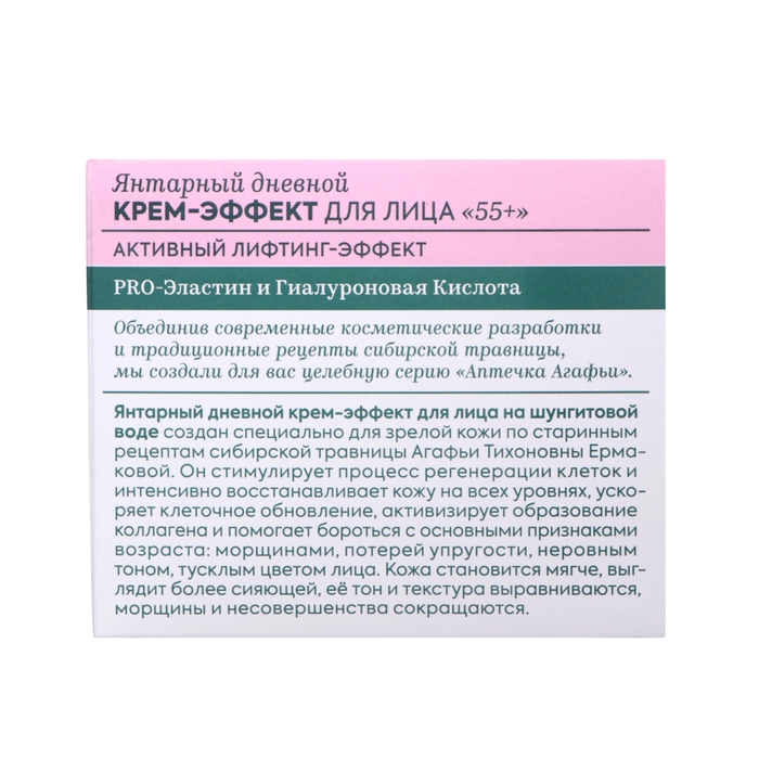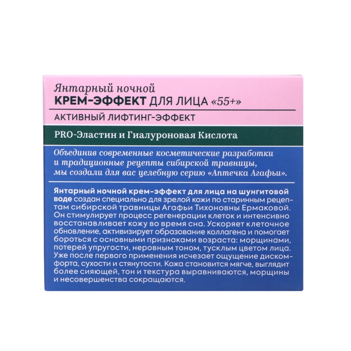 Янтарный дневной крем-эффект для лица 55+ Активный лифтинг эффект. Стимулирует процесс регенерации клеток и интенсивно восстанавливает кожу на всех уровнях, ускоряет клеточное обновление, активизирует образование коллагена и помогает бороться с основными признаками возраста: морщины, потеря упругости, неровный тон, тусклый цвет лица. Кожа становится мягче, выглядит более сияющей, её тон и текстура выравниваются, морщины и несовершенства сокращаются. Янтарный ночной крем-эффект для лица 55+ Активный лифтинг эффект.