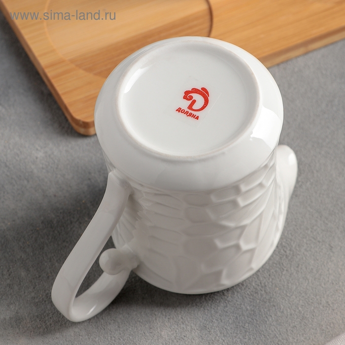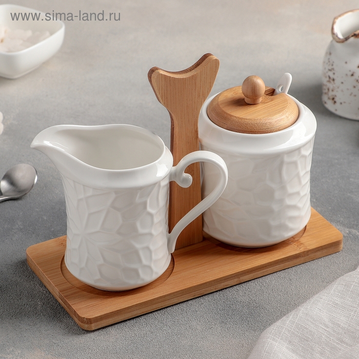 Набор фарфоровый сервировочный на деревянной подставке Доляна «Кракле», 2 предмета: молочник 170 мл, сахарница с ложкой, цвет белый