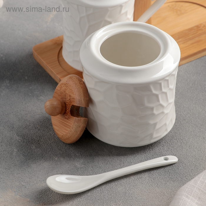 Набор фарфоровый сервировочный BellaTenero «Тюльпан», 4 предмета: молочник 200 мл, сахарница с крышкой 170 мл, бамбуковая подставка, ложка, цвет белый
