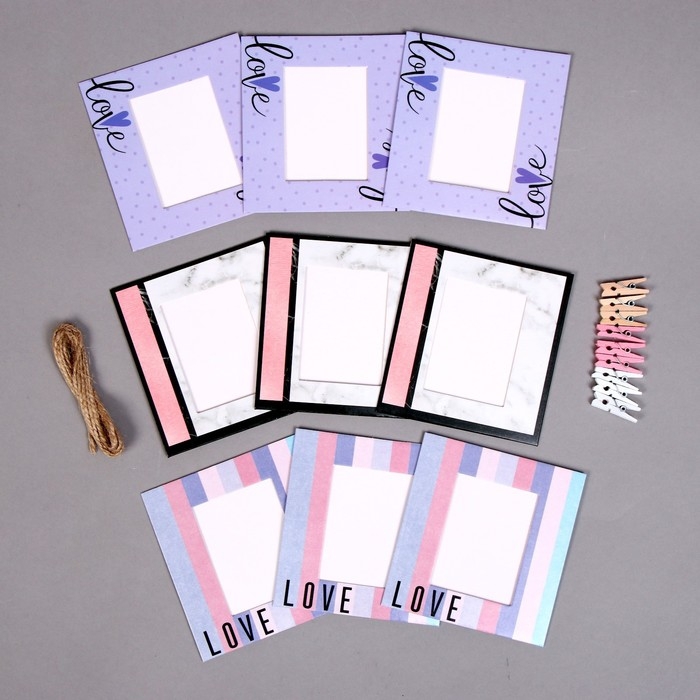 - В комплекте 9 фоторамок из прочного картона, красивые прищепки и верёвка.