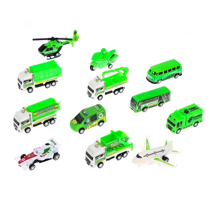 - Машинки и самолёт имеют инерционный механизм. Чтобы привести в движение, достаточно толкнуть их. Автомобили мгновенно наберут скорость и поедут под действием инерционного механизма.