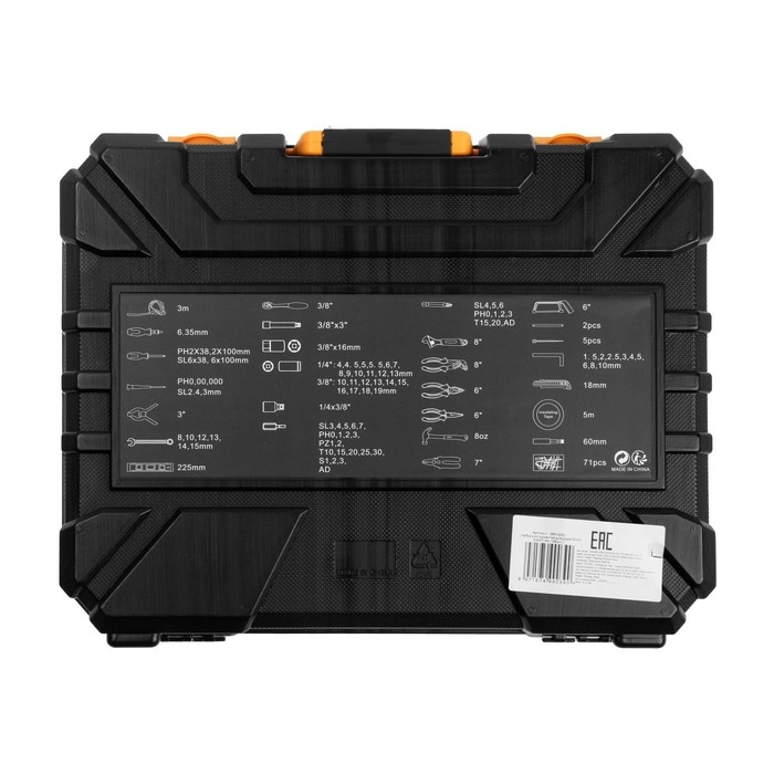 Гаечные ключи, Длинногубцы, Нож, Ножовка, Плоскогубцы, Разводной ключ, Рулетка, Стриппер, Струбцина, Торцевые головки биты, Трещотка, Уровень, Шестигранные ключи