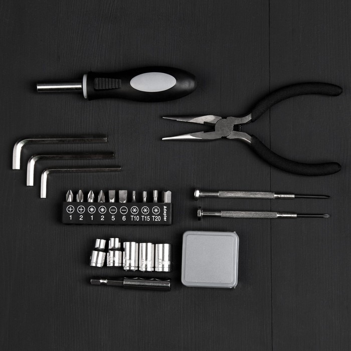 Биты, Держатель бит, Отвёртка, Рулетка, Тонкогубцы, Торцевая головка, Удлинитель, Шестигранник