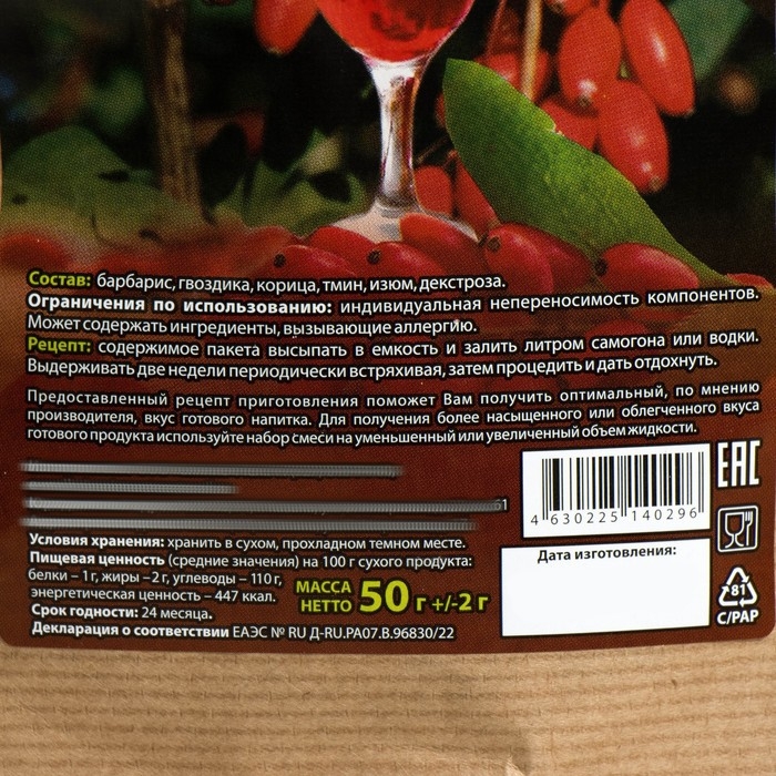 Набор из трав и специй для приготовления настойки "Барбарисовая", 50 гр