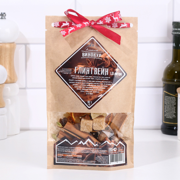 Состав: кардамон для глинтвейна, апельсин сушеный, сахар тростниковый, имбирь, бадьян, гвоздика, изюм, корица, мускатный орех, перец душистый.