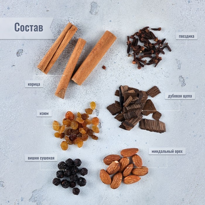 Состав: Дубовые кубики средней обжарки (Кавказ), корица, миндаль, изюм, гвоздика, вяленая вишня.