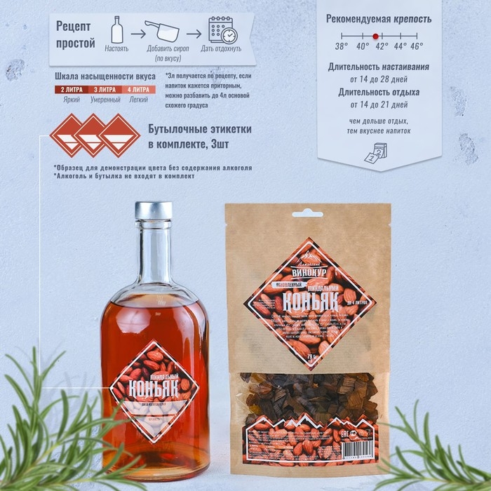 Вкусовые качества: миндальный коньяк обладает терпким вкусом с долгим послевкусием вишни. Дубовые кубики средней обжарки облагораживают вашу настойку и дают нотки выдержанного элитного алкоголя.
