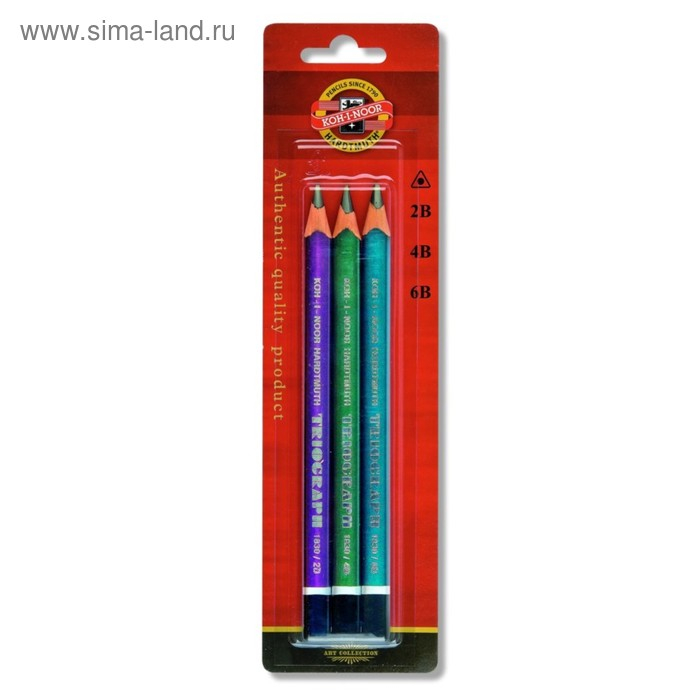 Набор карандашей чернографитных разной твердости 3 штуки Koh-I-Noor 1835, 2B-6B, утолщённые Triograph в блистере