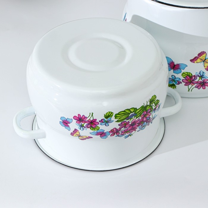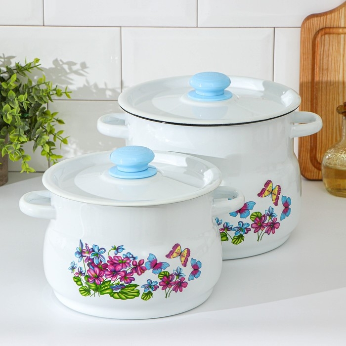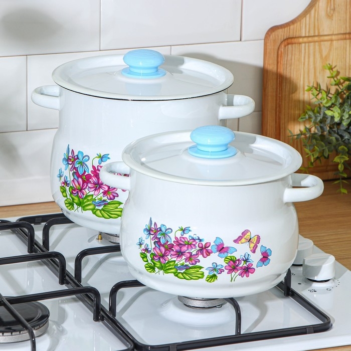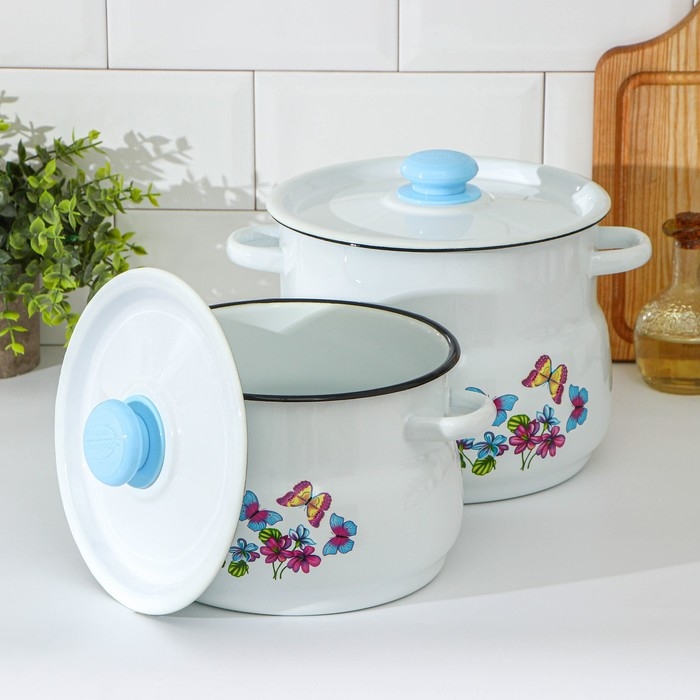 Кастрюли сделаны из качественной стали, покрытой эмалью с декоративным рисунком. Они отлично подходят для приготовления и хранения различных блюд.