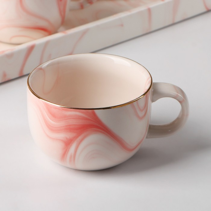 Набор керамический чайный «Мрамор», 6 предметов: чайник 800 мл, 4 кружки 170 мл, поднос 31×21×2,5 см, цвет розовый