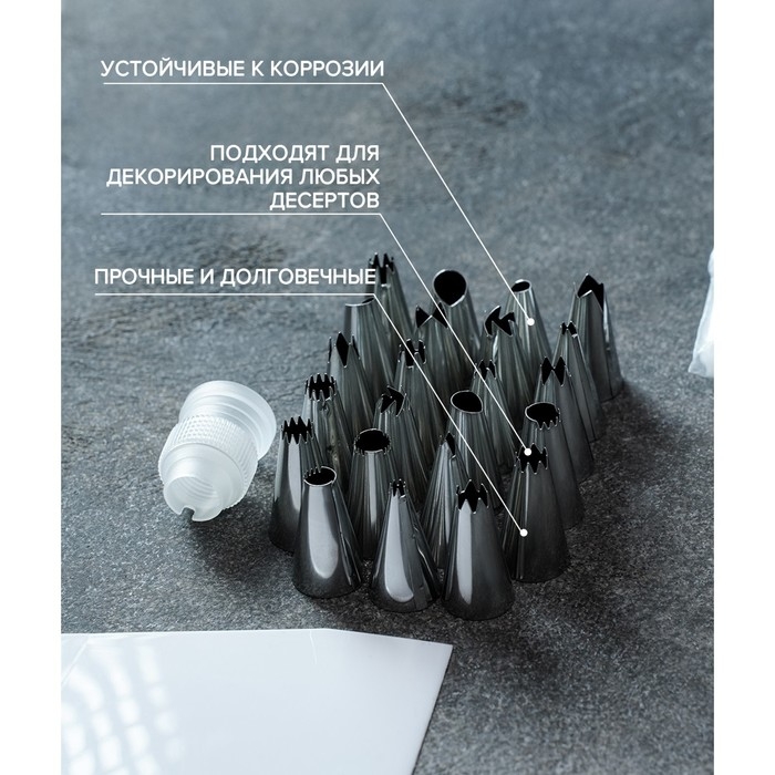 Набор предназначен для украшения выпечки и готовых кондитерских изделий. Наполните мешок кремом, выберите насадку — и приступайте к созданию кулинарного шедевра!