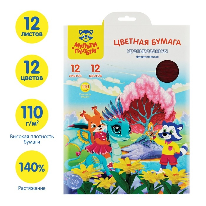 Бумага с крепированной поверхностью «Мульти-Пульти» серии «Енот в сказке» – это замечательный материал для творчества не только детей, но и взрослых. Товар представлен в наборе из 12 листов формата А4 разных цветов в папке с замком для удобного хранения и европодвесом. Бумага плотностью 110 г/кв. м имеет размер 20*28,5 см и растяжение до 140%. Более плотная фактура бумаги и большая способность к растяжению позволяет создавать объемные яркие поделки: цветы, платья для кукол и вызывает у детей большой интерес к творческому процессу. Разрезая, сгибая, склеивая изделие, ребенок производит действия, положительно влияющие на моторику рук. Работа с этим материалом помогает развить и творческие качества малыша: чувство цвета, формы, композиции.