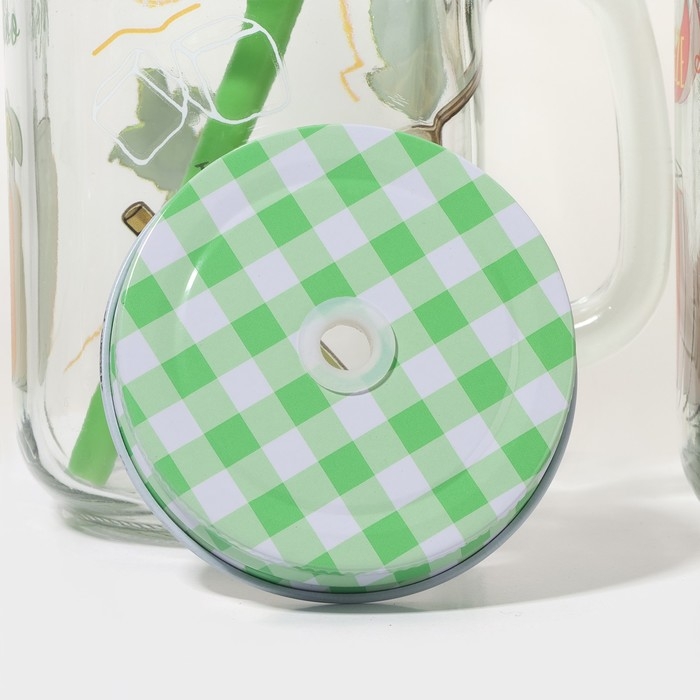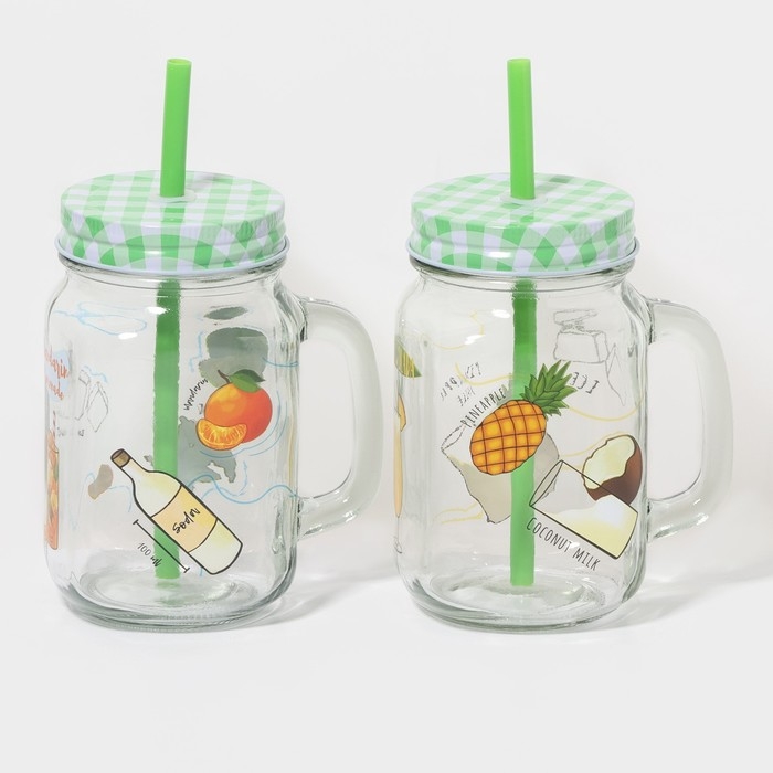 Набор кружек стеклянных Доляна «Летняя прохлада», 2 предмета: 2 кружки с крышками и трубочками 450 мл