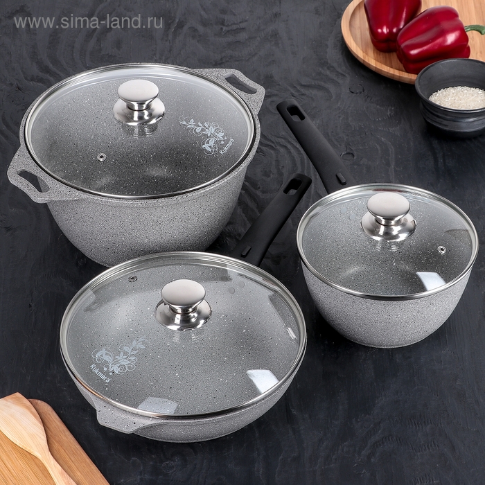 Набор кухонной посуды «Мраморная №4», крышка, съёмная ручка, антипригарное покрытие, цвет светлый мрамор