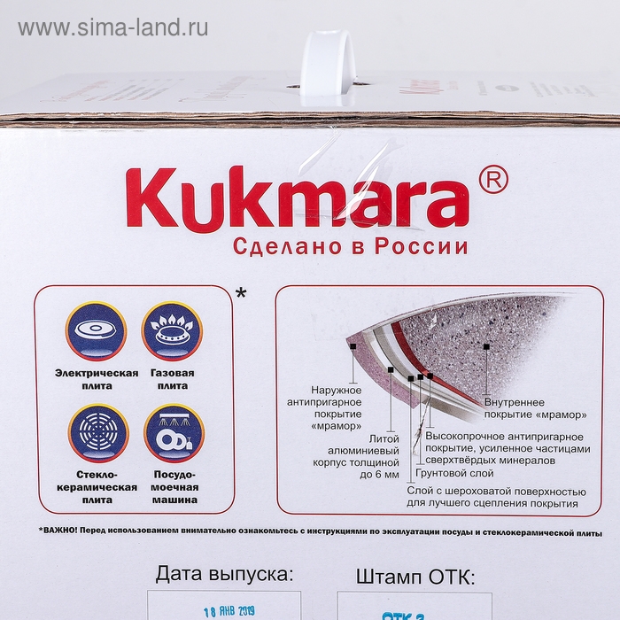 Посуда Kukmara сделана из литого алюминия. Имеет инновационное антипригарное мраморное покрытие нового поколения, которое изготовлено на водной основе по немецкой технологии (Weilburger Coatings GmbH) и усилено сверхтвёрдыми частицами минералов.