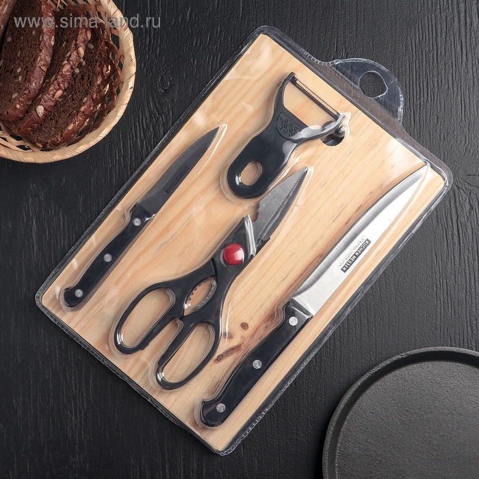 Набор кухонных принадлежностей, 5 предметов: ножи 9,2 см, 15,2 см, овощечистка, ножницы, доска, цвет чёрный