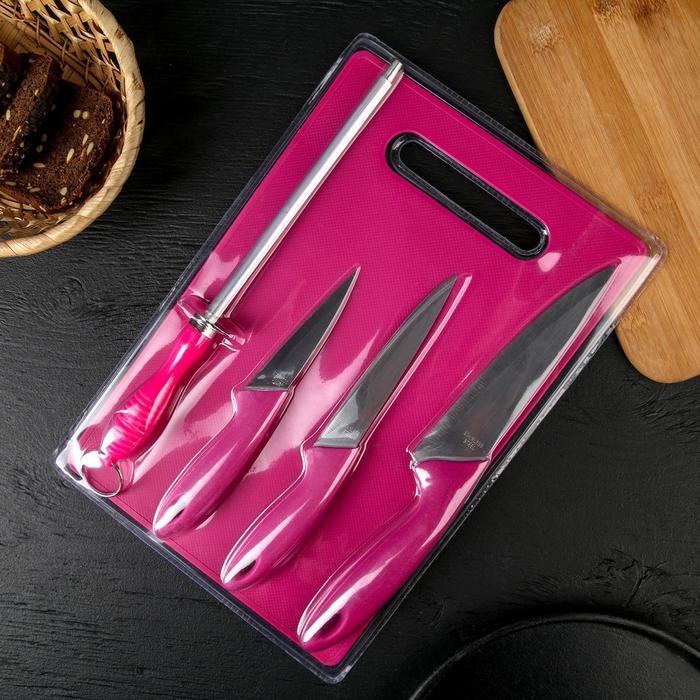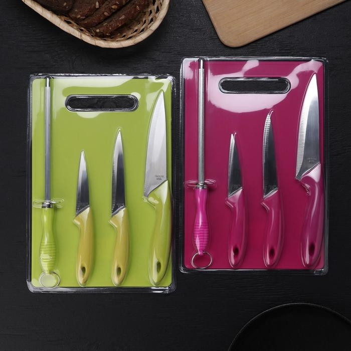 Набор кухонных принадлежностей, 5 предметов: ножи 9 см, 12 см, 15 см, мусат, доска, цвет МИКС