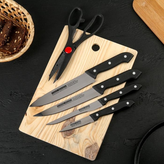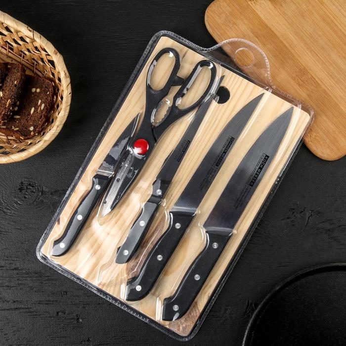 Набор кухонных принадлежностей, 6 предметов: 4 ножа 8 см, 13 см, 16 см, 16 см, ножницы, доска 28×18 см