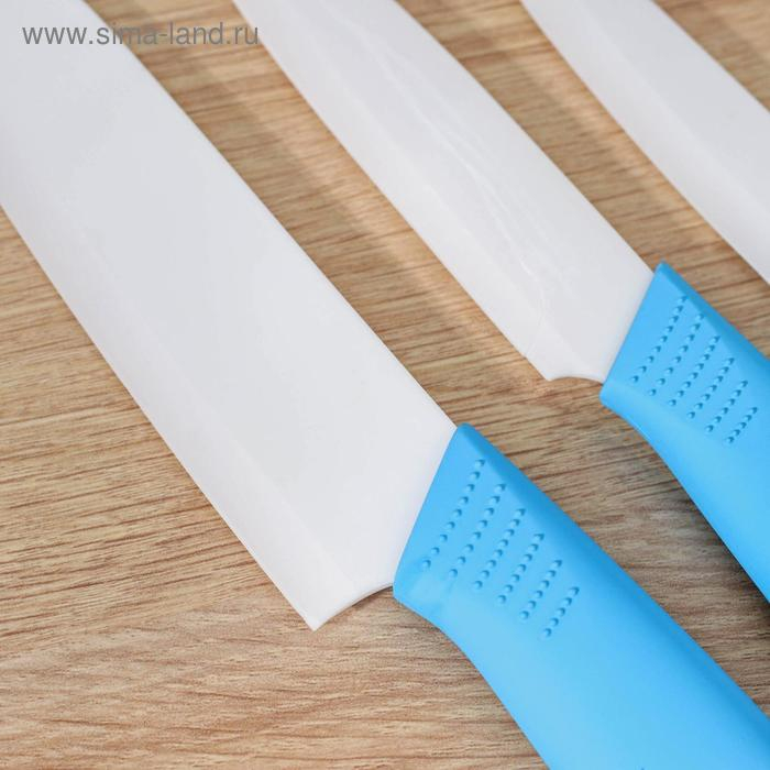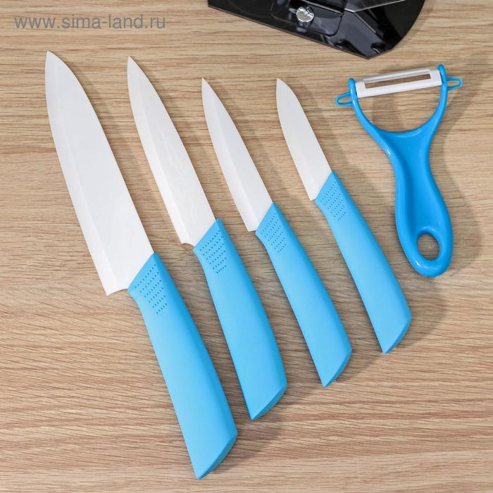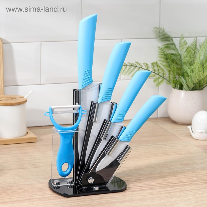Набор кухонный на подставке Доляна «Симпл», 5 предметов: ножи 7,5 см, 10,5 см, 13 см, 15 см, овощечистка, цвет голубой