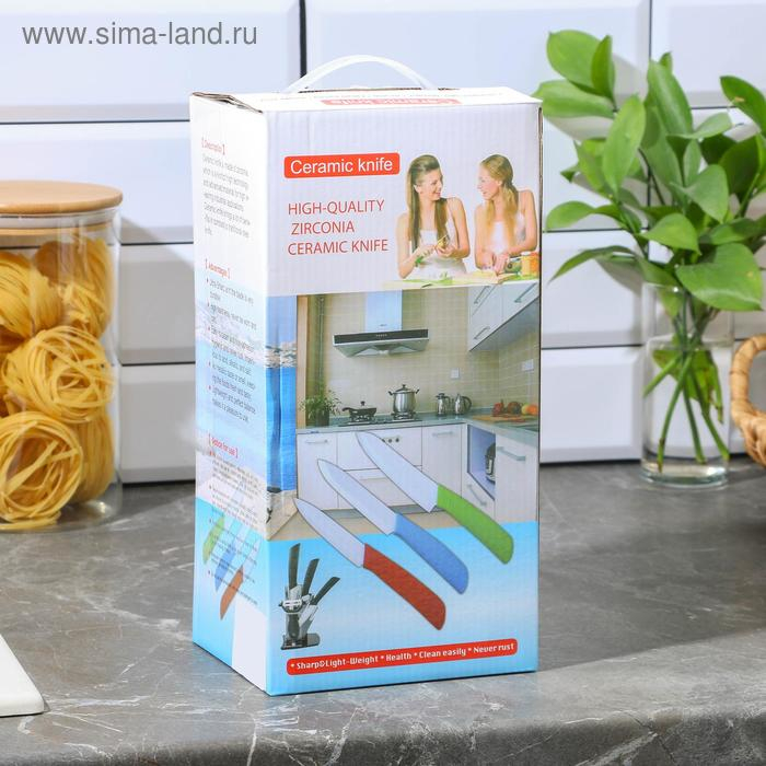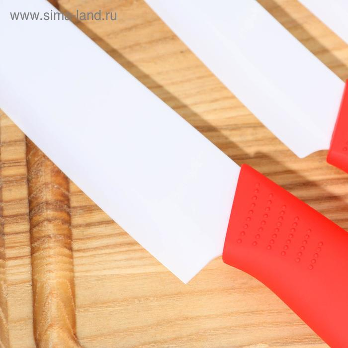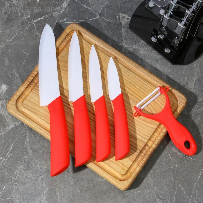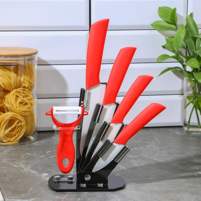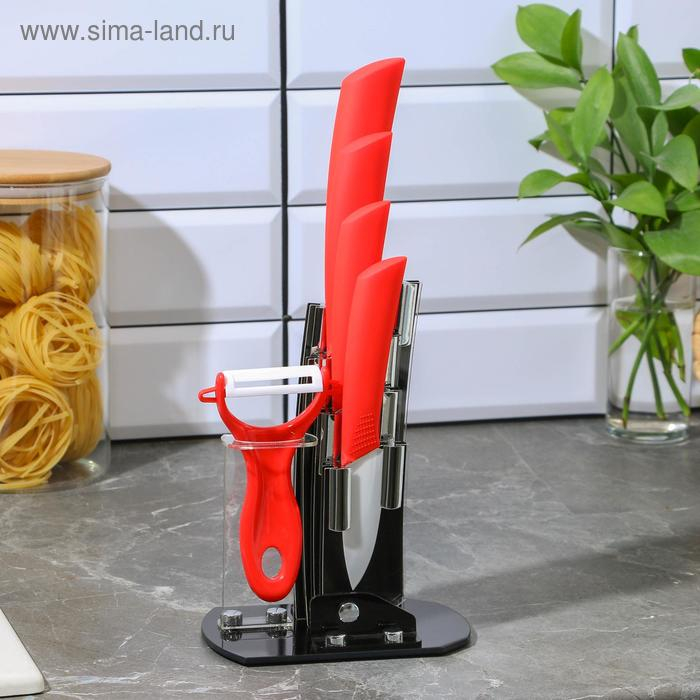 Набор кухонный на подставке Доляна «Симпл», 5 предметов: ножи 7,5 см, 10,5 см, 13 см, 15 см, овощечистка, цвет красный