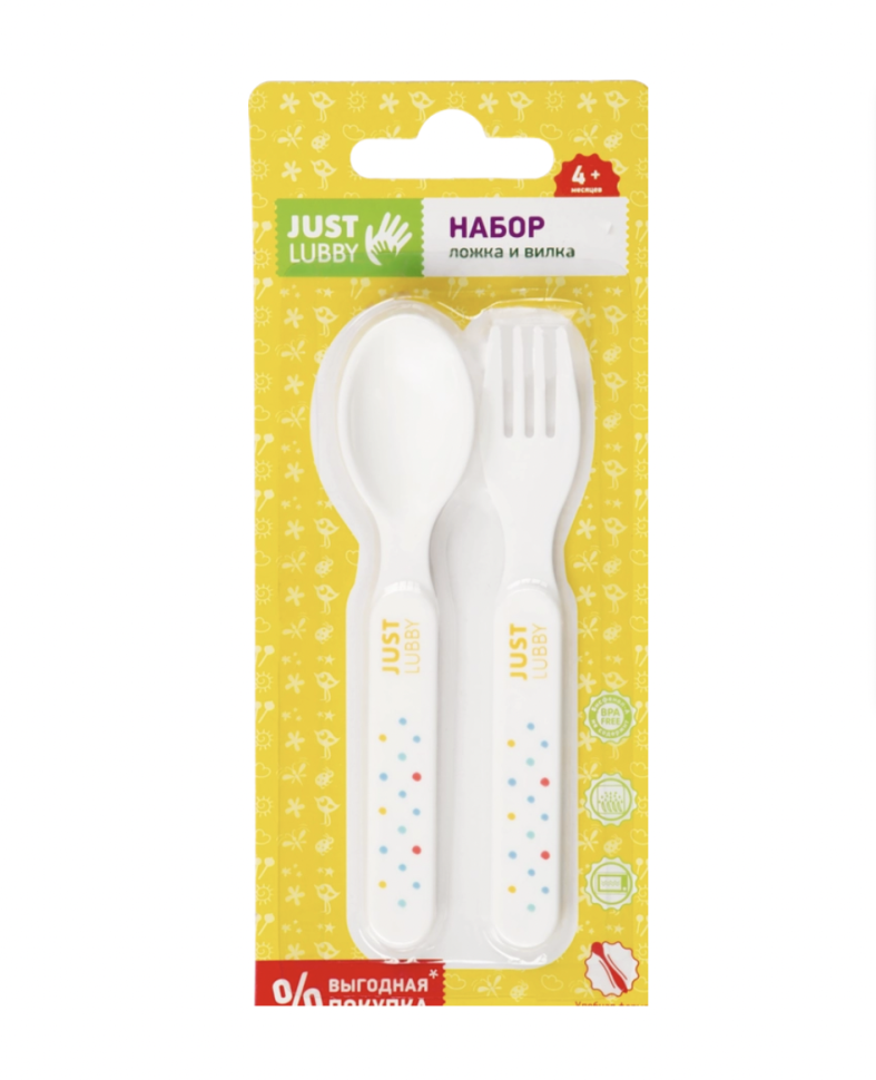 9х1,3х21,5см. Набор из ложки и вилки LUBBY предназначен для малышей в возрасте старше 4 месяцев. Столовые приборы изготовлены из прочного полипропилена, устойчивого к нагреванию и окрашиванию. Вилка с округлой формой зубчиков исключает любую возможность получения травм. Благодаря комфортной длине столовых приборов можно доставать еду даже с самого дна баночки с детским питанием.