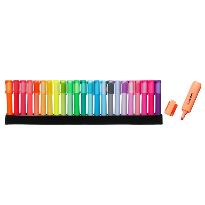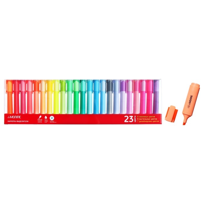 Набор маркеров-выделителей "deVENTE" 23 цвета (8 неоновых, 8 пастельных, 7 классических светлых цветов) плоский корпус, скошенный наконечник, ширина линии 1-5 мм, на поддоне в пластиковой коробке.