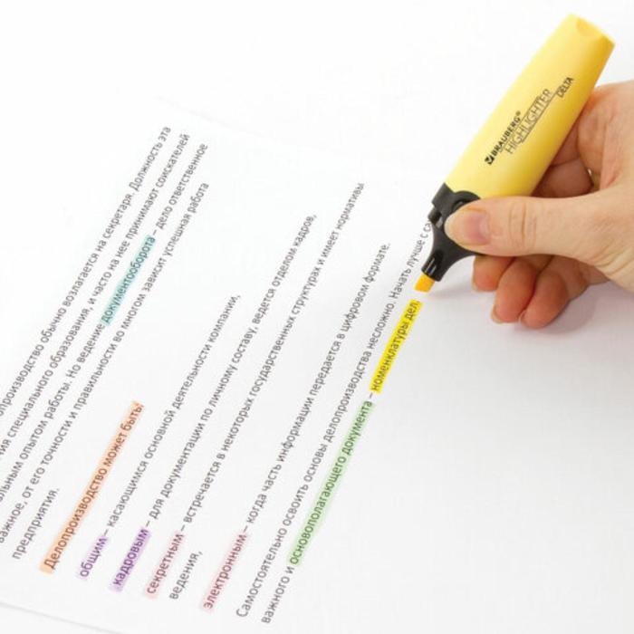 Текстовыделители BRAUBERG "DELTA PASTEL" предназначены для выделения текста на бумаге любого типа, включая факс-бумагу. В наборе шесть пастельных цветов: ванильный, мятный, пастельный розовый, персиковый, лавандовый и бирюзовый. Овальная форма корпуса, диаметр которого 25 мм. Особый пастельный оттенок создает мягкие переходы и позволяет равномерно выделить текст. Скошенный наконечник имеет толщину линии письма от 1 до 5 мм, что обеспечивает удобство при работе с текстом, напечатанным мелким шрифтом, или таблицами. Благодаря особой водной основе чернил текстовыделители не высыхают без колпачка в течение 8 часов. Текстовыделители обладают экономным расходом чернил, при этом длина линии письма достигает 300 метров. Чернила быстро впитываются и тем самым предотвращают размазывание в процессе использования. Цвет колпачка и корпуса соответствует цвету чернил.