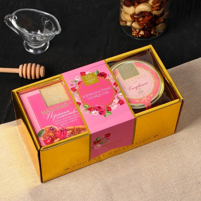 Крем-мед Peroni - это 100% настоящий эко-продукт, изготовленный с любовью и заботой, пыльца и нектар собранный пчелами на пасеках с экологически чистых полей и пчелиных фермерский угодий. Набор "Удовольствие со вкусом" - баночка меда суфле 350 г и черный чай 45 г, уложенные в стильную подарочную упаковку премиум качества. Состав крем меда натуральный, без искусственных добавок, красителей и консервантов, ведь мед - отличный консервант, а орехи, сок фруктов и сублимированные ягоды придают ему приятный нежный цвет.