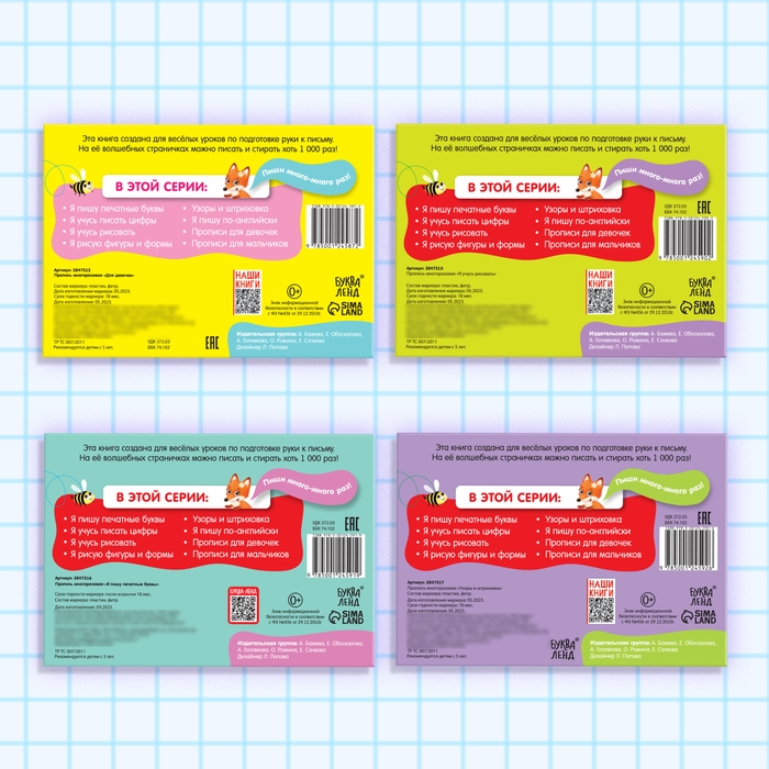 Многоразовая книжка «Пиши-стирай» — это весёлые задания, где малыш будет обводить и дорисовывать, тем самым подготавливая руку к письму. Особенность издания: глянцевые страницы. С них без труда можно стереть маркер. Именно поэтому заниматься с книжкой можно не один раз.