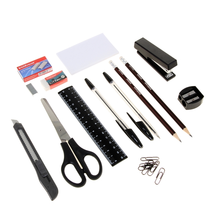 Идеальное решение для хранения различных канцелярских принадлежностей. Устойчивая и вместительная, подставка эффективно организует рабочее пространство. В комплекте 13 предметов: степлер № 10, 1000 скоб, 2 карандаша, 2 ручки, 30 скрепок, ластик, точилка, линейка, ножницы, нож канцелярский, блок бумаги для записей. Наполнение может отличаться от представленного.