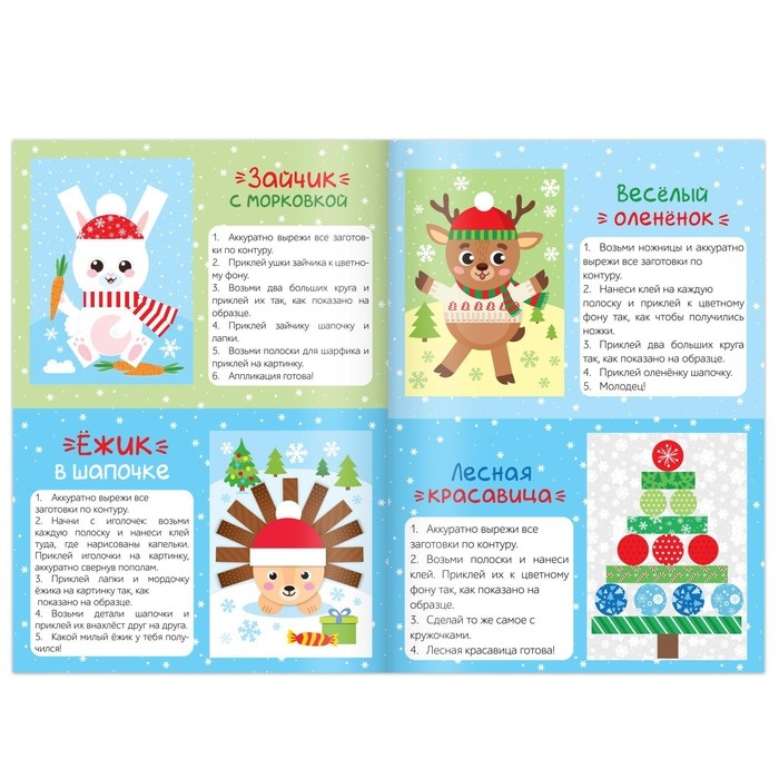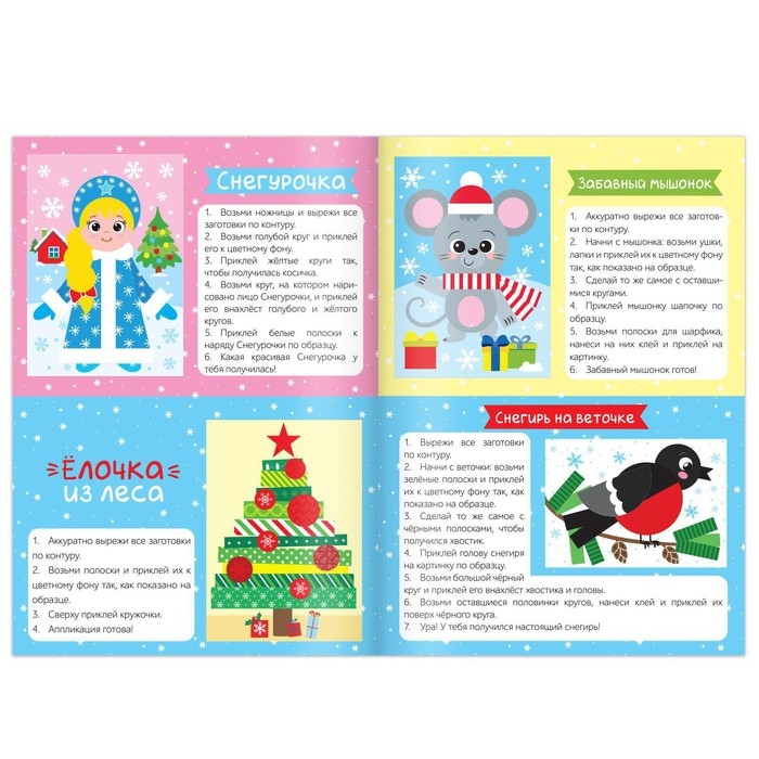 - Рядом с каждой поделкой расположена подробная инструкция. По ней малыш без труда создаст аппликацию.