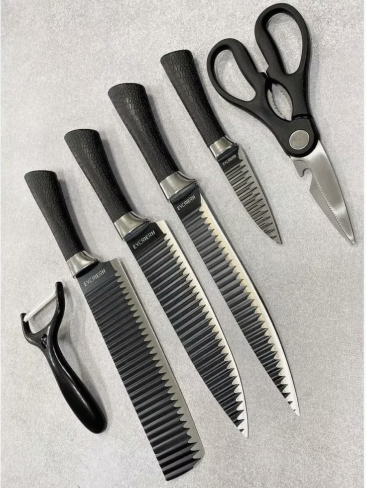 Острые лезвия. Антибактериальное покрытие. Высокое качество. Красивая подарочная коробка. Удобная эргономичная ручка. С помощью нашего набора Вы сможете нарезать абсолютно любые продукты: от мяса и хлеба до спелых фруктов и овощей. Для максимального удобства, ручки ножей изготовлены из нескользящего материала. Отличная идея для подарка. Именно поэтому стоить купить именно наш набор кухонных ножей. Материал: высококачественная нержавеющая сталь 18/10. Мраморное покрытие. Эргономичная пластиковая ручка. В комплекте: нож поварской - 20 см, нож для хлеба - 20 см, нож для нарезки-20 см, нож универсальный - 12,5 см, нож для чистки овощей - 9 см, керамическая овоще чистка.