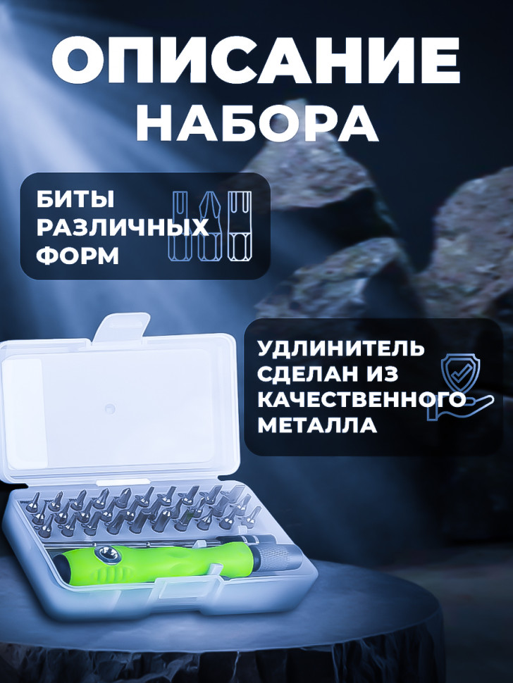 Набор отверток для точных работ ISA T32 включает в себя сборную отвертку, удлинитель и 30 сменных бит. Данный набор является отличным инструментом для каждого специалиста, работающего с такой техникой как ноутбуки, смартфоны, планшеты, фото, видеокамеры и не только. Эта отвертка с набором бит подойдет для работы с любыми предметами, в конструкции которых есть маленькие крепежные элементы и для ремонта которых требуется высокая точность манипуляций. Отвертка с битами-насадками поставляется и храниться в специальном пенале, который состоит из крепкого пластикового бокса с фиксирующим замком и пластикового органайзера, в котором рукоятка отвертки и биты, фиксируясь, хранятся каждый в своем отделе. Такой набор битов с отверткой удобно носить с собой и применять его в случае необходимости. Сама отвертка и биты к ней изготовлены из нержавеющей хром-ванадиевой стали. Рукоять отвертки выполнена из толстого пластика. Рукоятка удобно лежит в руке, и позволяет эффективно передавать крутящий момент на детали. Это отвертка со сменными битами будет идеальным подарком человеку, чья работа или хобби связаны с точным ремеслом создания изделий или ремонтом.