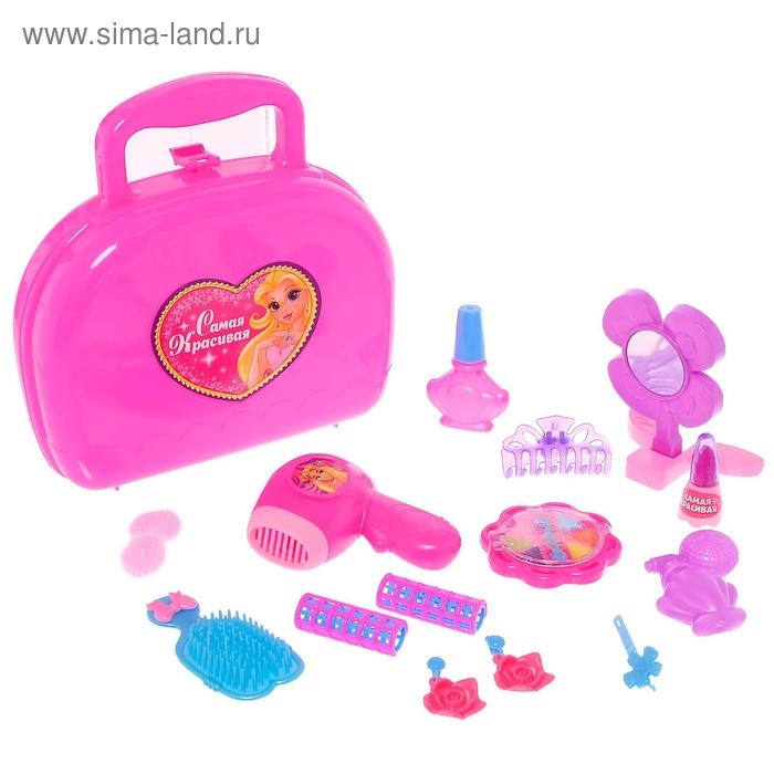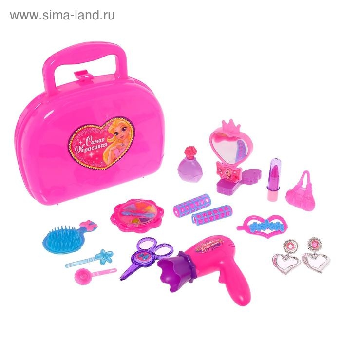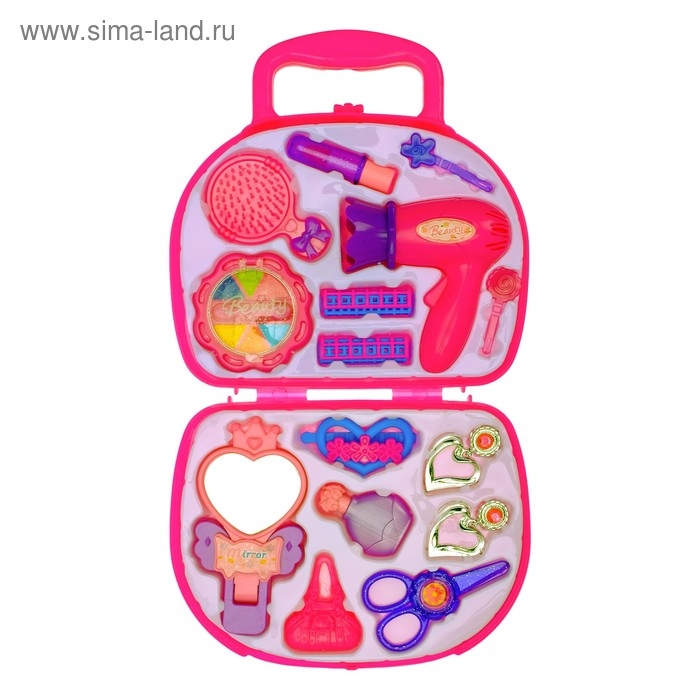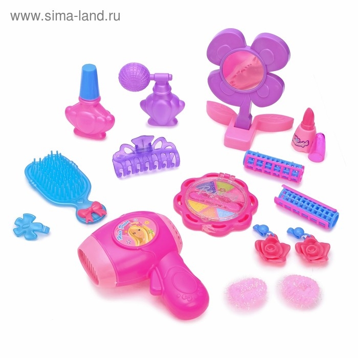 Чтобы стать настоящей звездой вечеринки, достаточно воспользоваться наборчиком. В него входит: фен, расчёска, заколочки, зеркальце, духи, помада, сумочка, серёжки и многое другое! Девочка почувствует себя маленькой принцессой, придумает и воплотит множество увлекательных сюжетов.