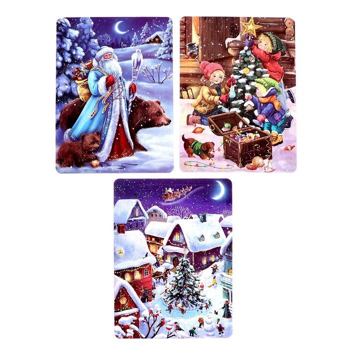 Соберите все детали в одно целое, и вы получите 3 красочных картинки с новогодним сюжетом размером 26 × 19 см каждая.