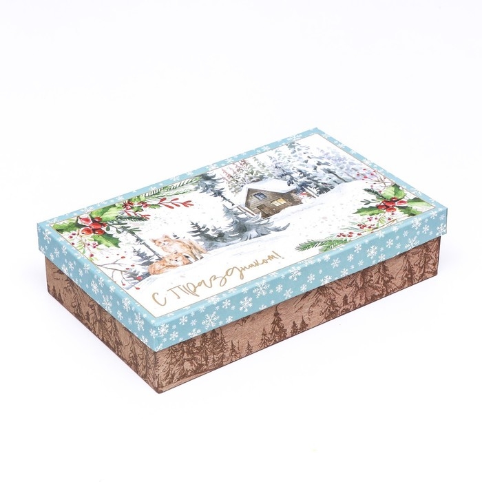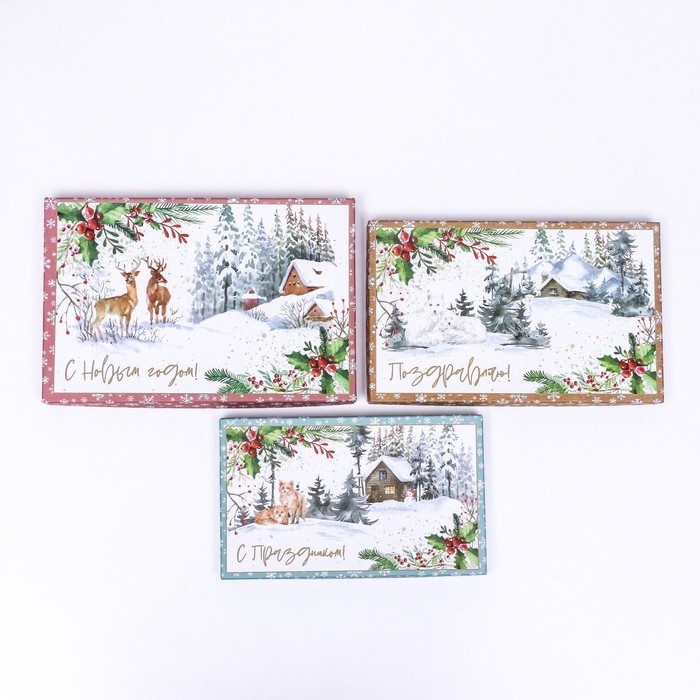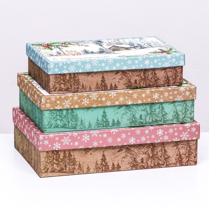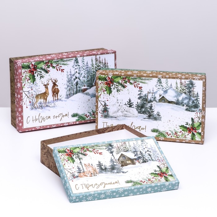 Набор подарочных новогодних коробок 3 в 1 "Олени в зимнее утро ", 29,5 х 19 х 8 - 24 х 14 х 5 см. Новый год
