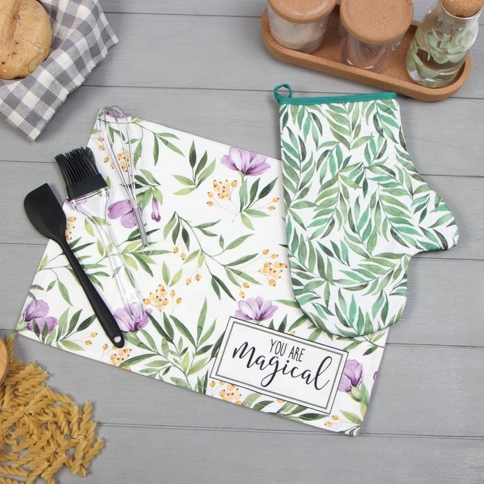 Набор подарочный Leaves: полотенце, варежка-прихватка, кисть, лопатка, венчик