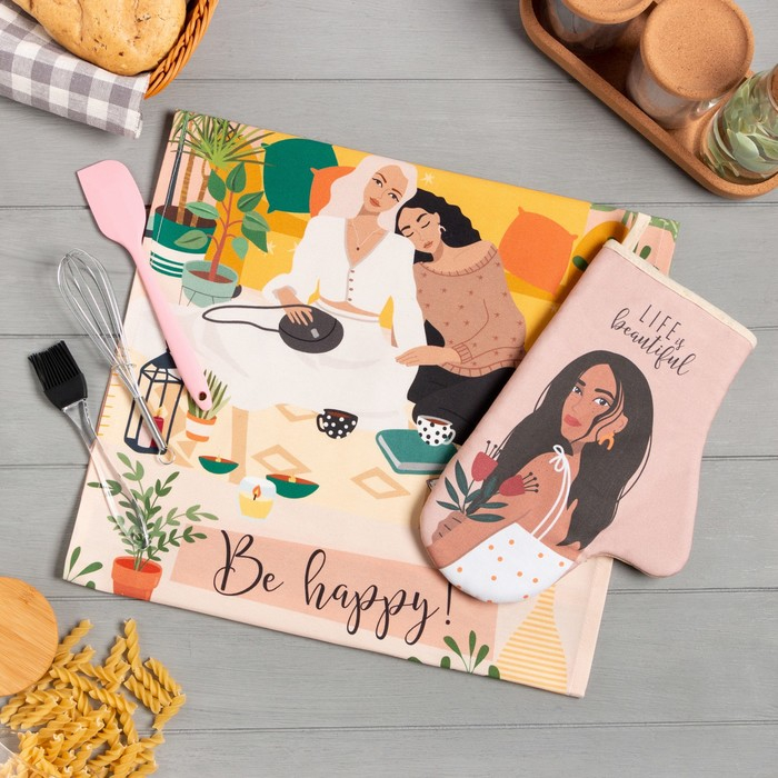 Набор подарочный Life is beautiful: полотенце, варежка-прихватка, кисть, лопатка, венчик