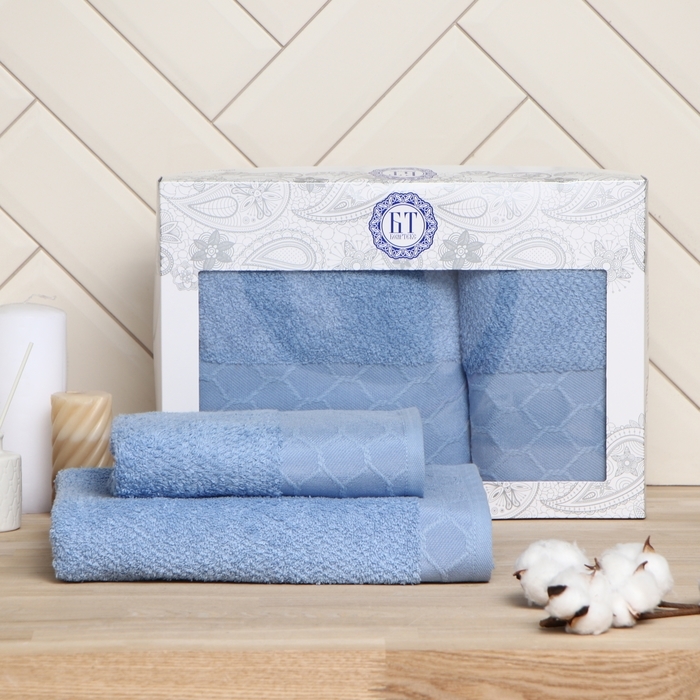 Набор полотенец в коробке Соты 50х90см, 70х130см, серо-голубой, махра 420г/м, хлопок 100%