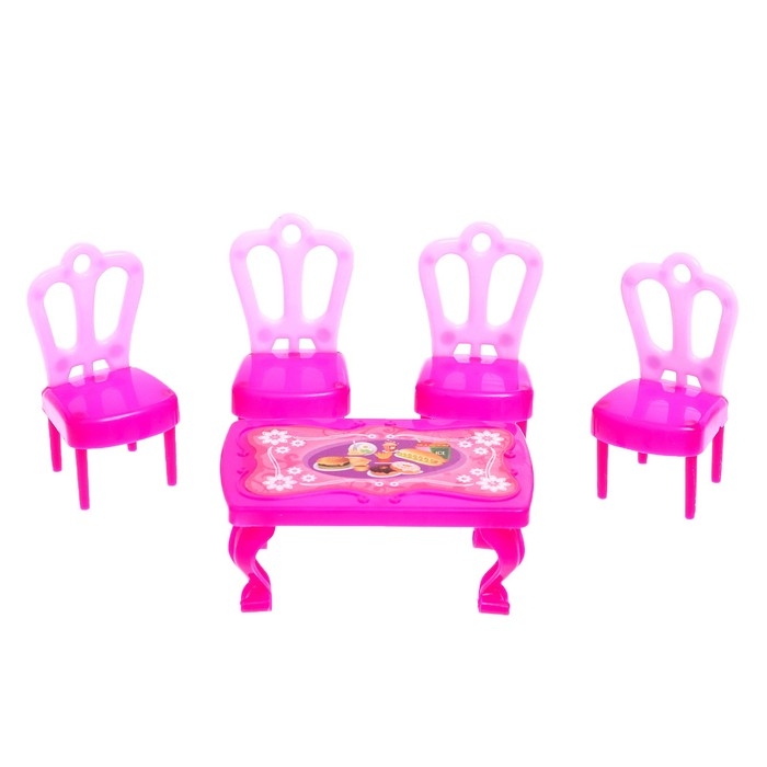 В наборе есть стол и стулья для гостиной. Дверки у домика открываются. Вся комплектация представлена на фото. Высота домика — 25 см.