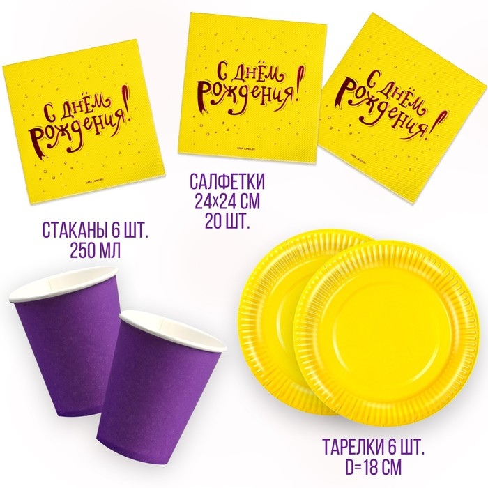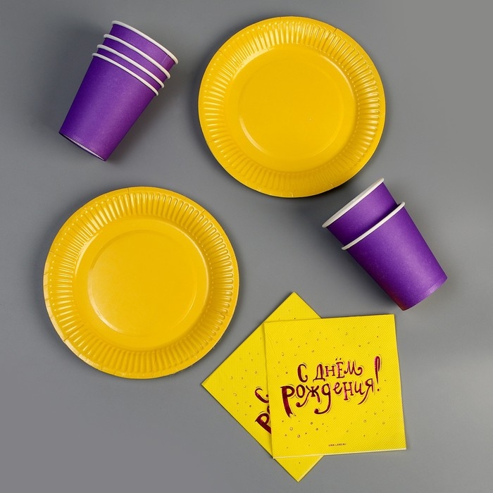 Набор посуды «С днём рождения»: салфетки 20 шт., стаканы 6 шт., тарелки 6 шт., фиолетовое