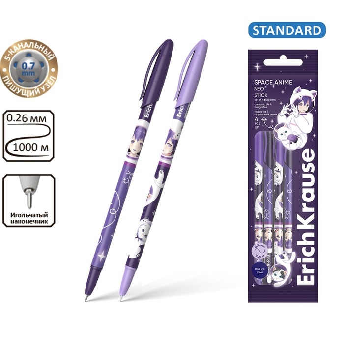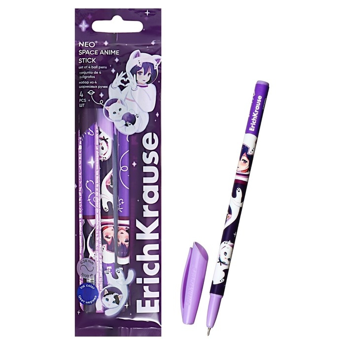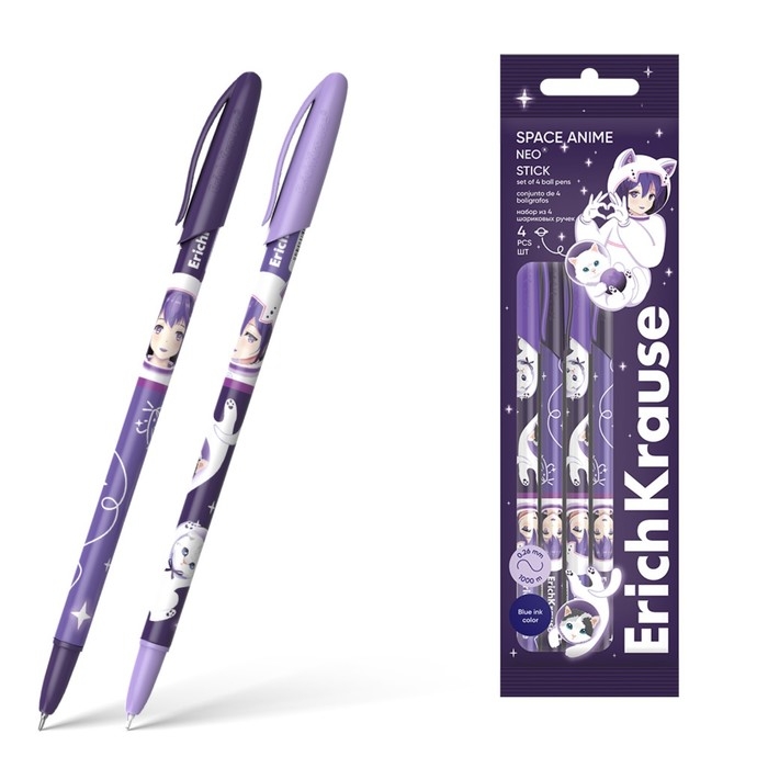 Набор ручек шариковых 4 штуки, ErichKrause Neo Stick Space Anime, узел 0.7 мм, чернила синие, длина линии письма 1000 метров, европодвес