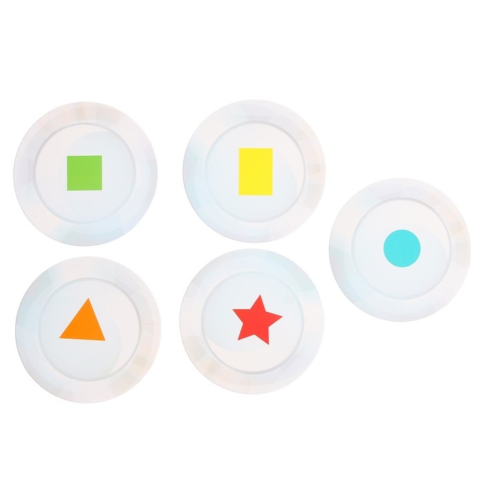 - Разложите перед ребёнком тарелочки и губки. Попросите его назвать фигуры, которые он видит и их цвета.