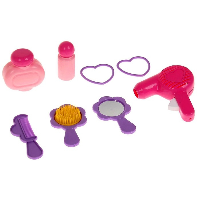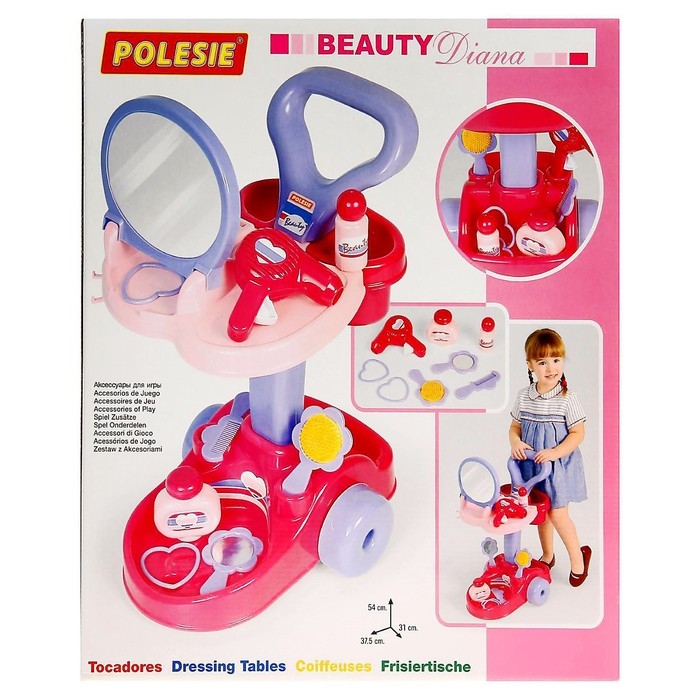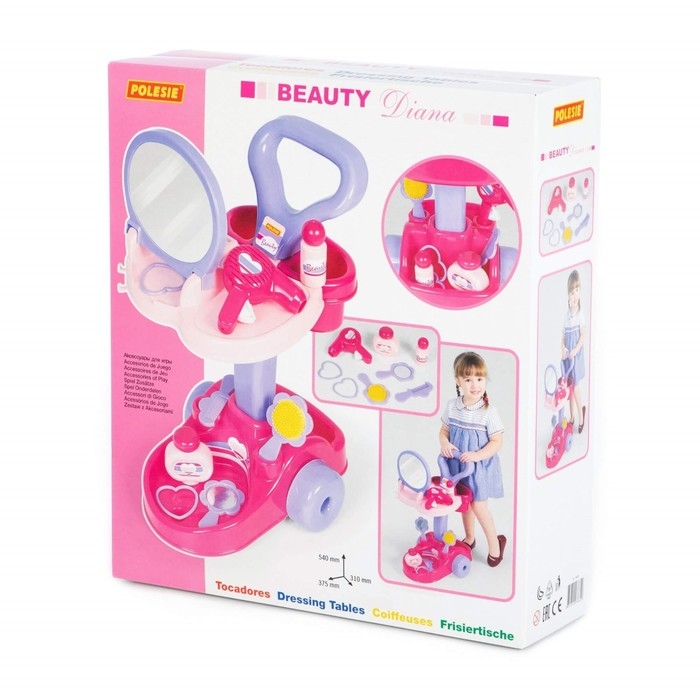 Если вашей дочурке нравится наводить красоту и создавать причёски, подарите ей собственный салон красоты! В игрушечном салоне «Диана» всё как у взрослых: большое круглое зеркало, розовый фен, 2 расчёски, разные флакончики и прочие принадлежности стилиста.