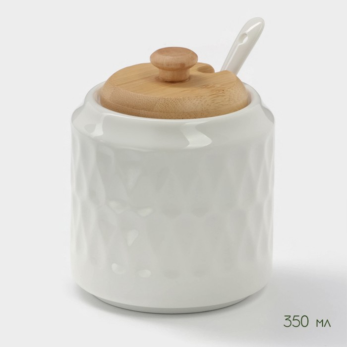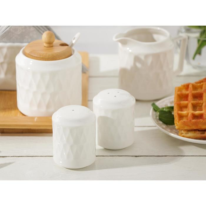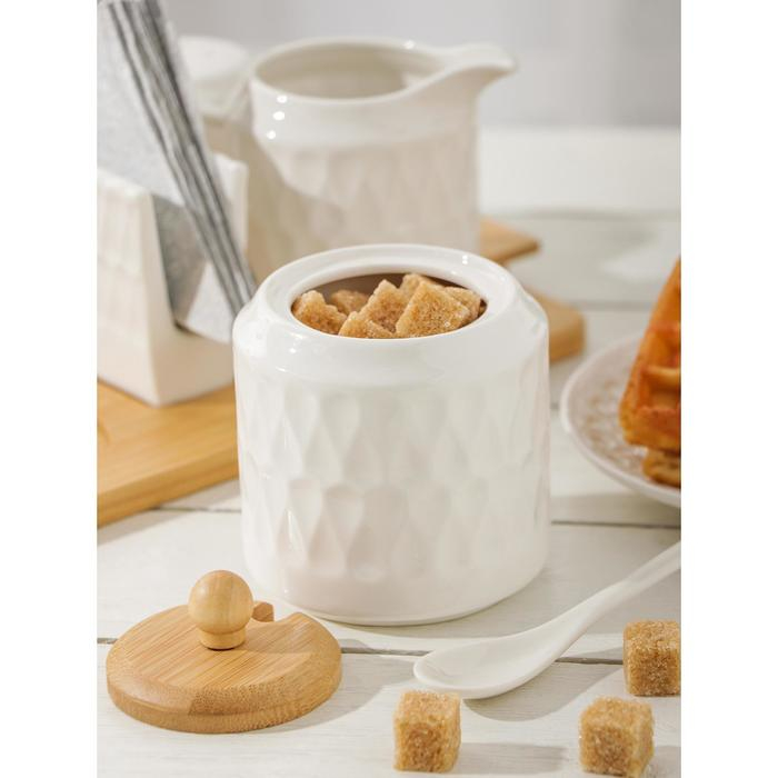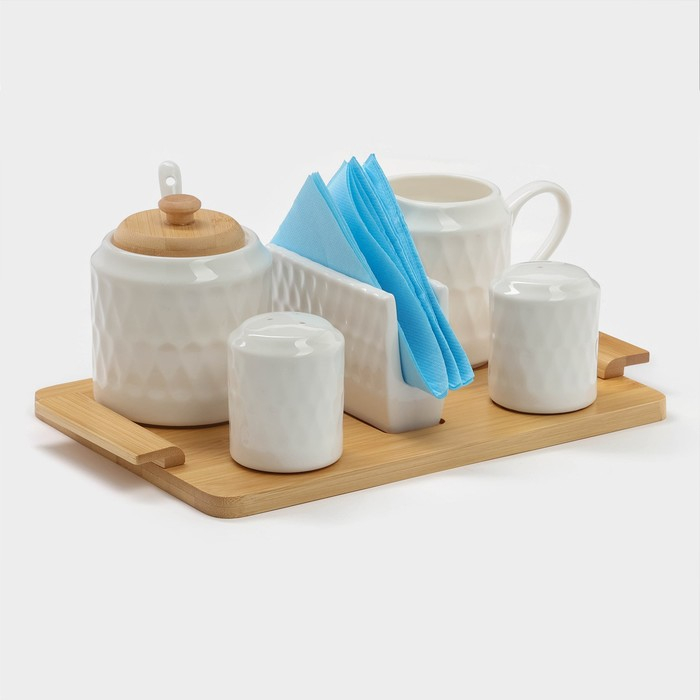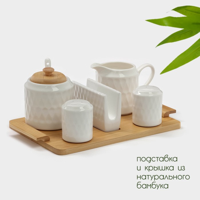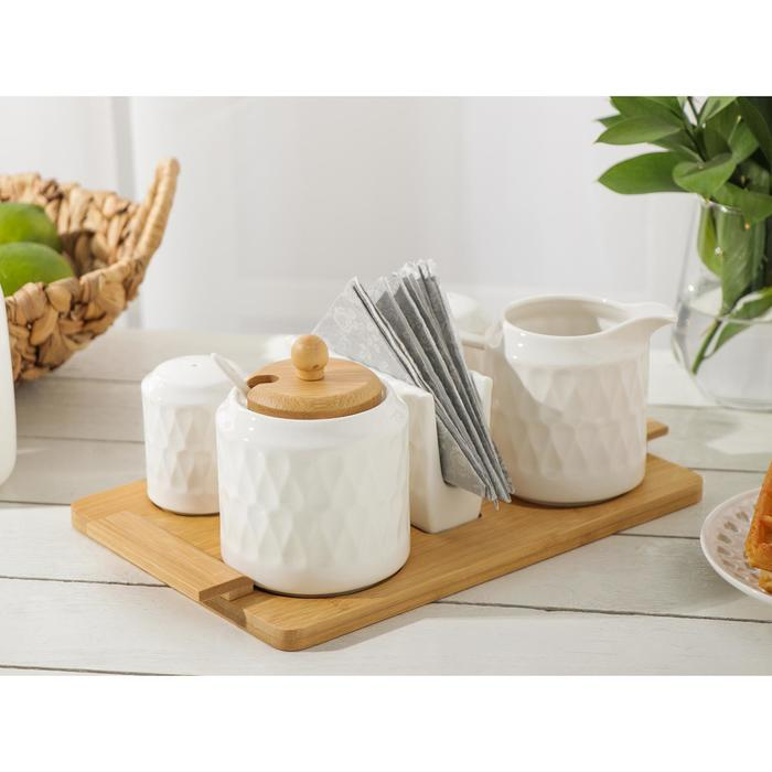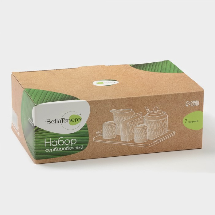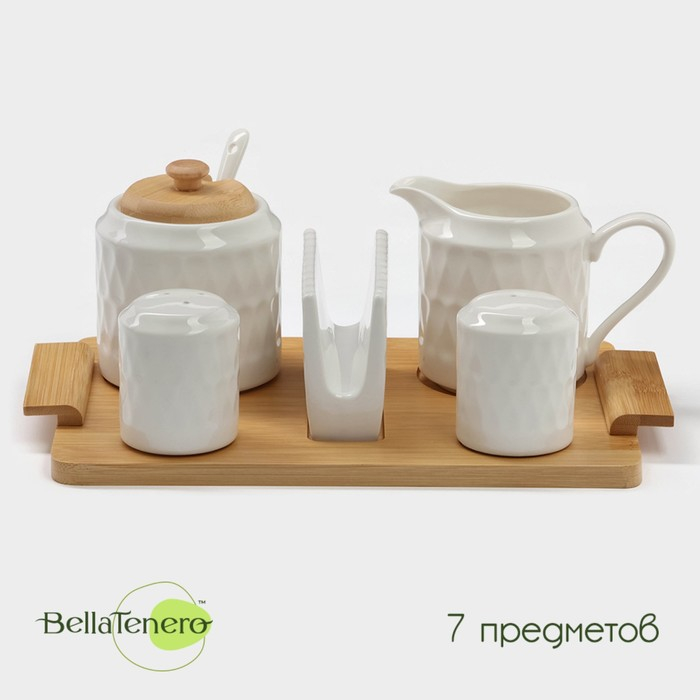 Набор сервировочный фарфоровый BellaTenero, 7 предметов: солонка 100 мл, перечница 100 мл, сахарница с ложкой 350 мл, молочник 310 мл, салфетница, подставка, цвет белый
