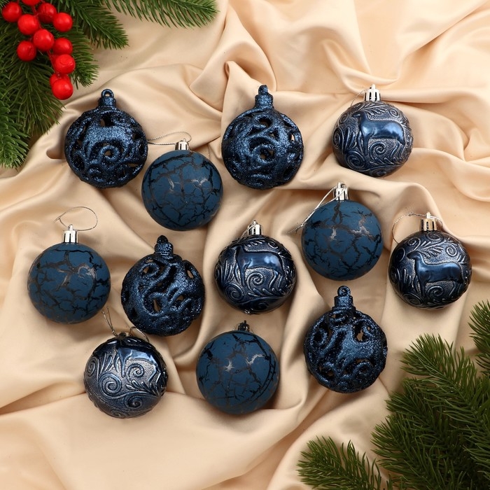 Набор шаров пластик d-6 см, 12 шт "Мелодия" орнамент, синий