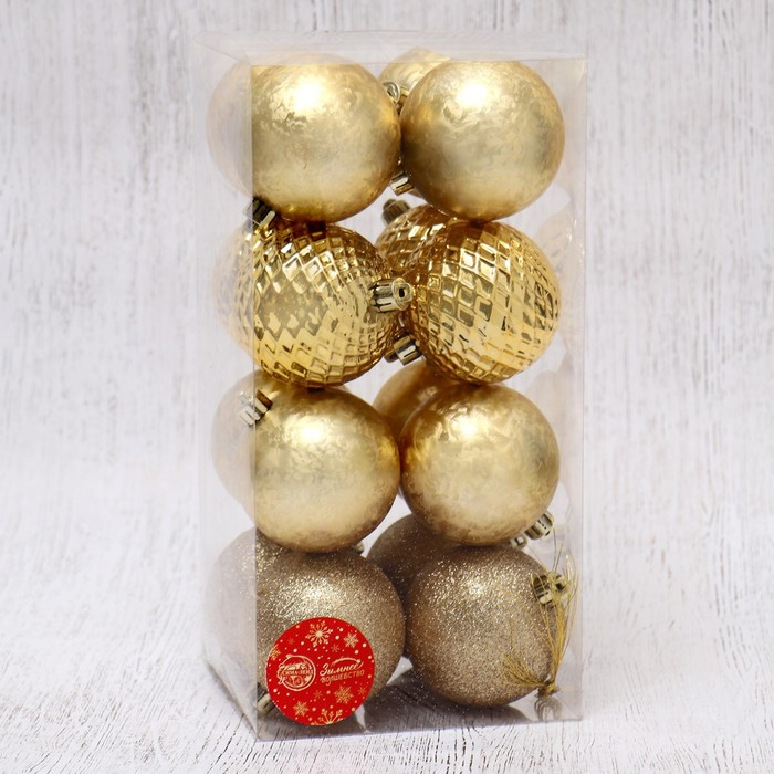 Набор шаров пластик d-7 см, 16 шт "Алета блеск сеточка" золото