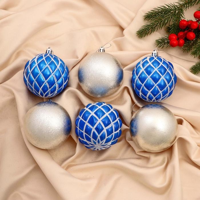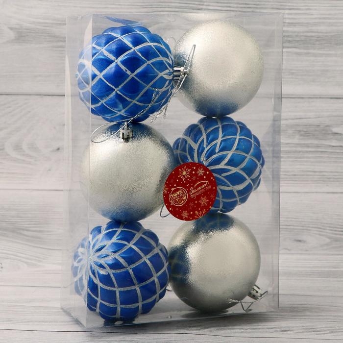 Набор шаров пластик d-8 см, 6 шт "Дорофея сеточка" сине-серебристый